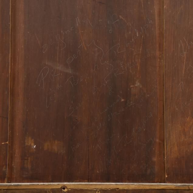 Rear boards with 20th century pencil inscription and paper detailing the family provenance beginning with William Beverly Randolph & Sarah Winston Rutherford of Richmond, then going to Martha Rutherford Linsley of Hanover Co., Va. (which relates to the copy of the estate letter showing Martha receiving a tall side board), thence to her son James G. Tinsley, then his daughter Mrs. B. P. Alsop, then Camilla Alsop Hyde...lower board reading "Purchased Dec. 17, 1987 by B & T Warthen from Aunt Mrs Hyde All of Richmond Virginia".