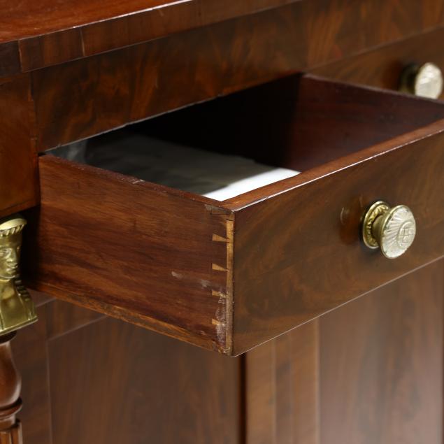 Attributed to Richmond, circa 1820, mahogany, mahogany veneer primary, white pine, poplar and deal secondary, multi-part form, projecting cornice with crotch mahogany vertically veneered frieze, four hinged doors with astragal moldings, reeded stiles, divided and shelved interior, flanked by 3/4 reeded columns, book-matched rear panel with block stiles, front baluster turned supports, the sideboard with vertically veneered edge and apron over three flush side-by-side drawers over four hinged paneled cabinet doors, divided and shelved interior, flanked by fully turned reeded columns with cast brass Egyptian bust capitals, front tapered reeded legs terminating in cast brass feet, paneled sides, rear straight legs from the solid.