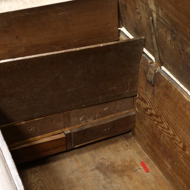 Rear edge of lid with cut/patch/repair at hinge area; central underside later medial board; missing lock/clasp/key; top with dark staining; right drawer with cut/patch to upper right corner of facing and later bottom boards; drawer runners rebuilt; feet are original - two with separation crack and repair.