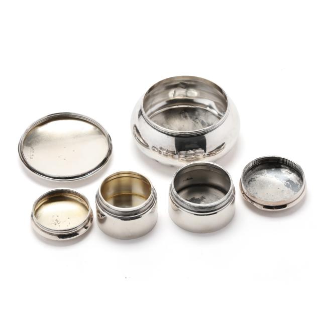 The oval frame with mark of Wm. B. Kerr & Co., with period monogram "MEK" (9 x 7 in.) (lacking pins to hold glass and backing in place, some wear to green velvet); two Edwardian silver dresser boxes with mark of Drew & Sons, London (1909) and one George V silver dresser box with mark Drew & Son, London (1916), each with applied cipher style monogram (the largest 2 1/4 x 4 1/4 in. diameter) (denting to each, the largest box's lid does not fit properly).