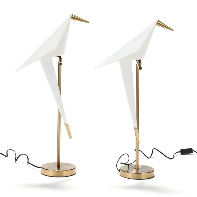 Contemporary, white plastic and brushed gold tone metal accents, two part form where the bird rests on the post form base, unmarked.