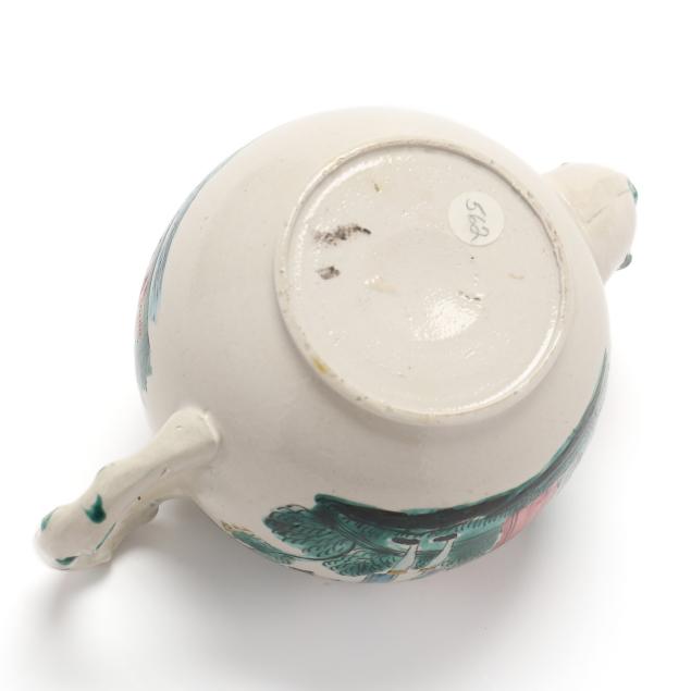 Mid-18th century, stoneware, of globular form with cover, decorated in polychrome enamels with figures standing within shrubbery on one side and a village scene on the other side, not signed.