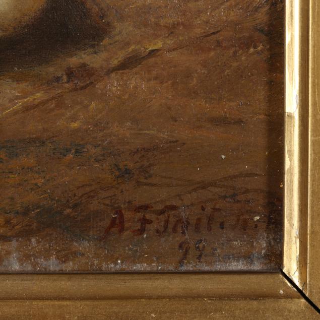 The Collection of the late Frances Stagg Nicholson Sanders, Raleigh, North Carolina Arthur Fitzwilliam Tait (1819–1905) was a British-born American artist renowned for his detailed and dynamic depictions of wildlife, rural landscapes, and frontier life. Born in Liverpool, England, Tait showed an early interest in art and trained at the Royal Institution in Manchester. He was deeply influenced by the works of naturalist painters and the burgeoning interest in wildlife art during the 19th century. In 1850, Tait immigrated to the United States, settling in New York City. Shortly thereafter, he began spending summers in the Adirondacks, where he found inspiration for his depictions of hunting scenes, deer, and the rugged American wilderness. His meticulously detailed works often captured animals in naturalistic settings, combining a keen observation of nature with a narrative quality that resonated with viewers.
