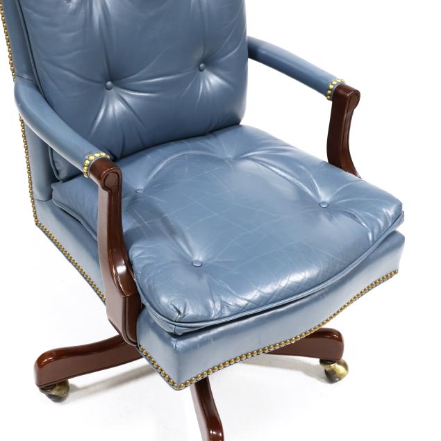 Late 20th century, Colonial blue leather with brass tack trim, mahogany arm supports and legs, swivel base, on casters, labeled.