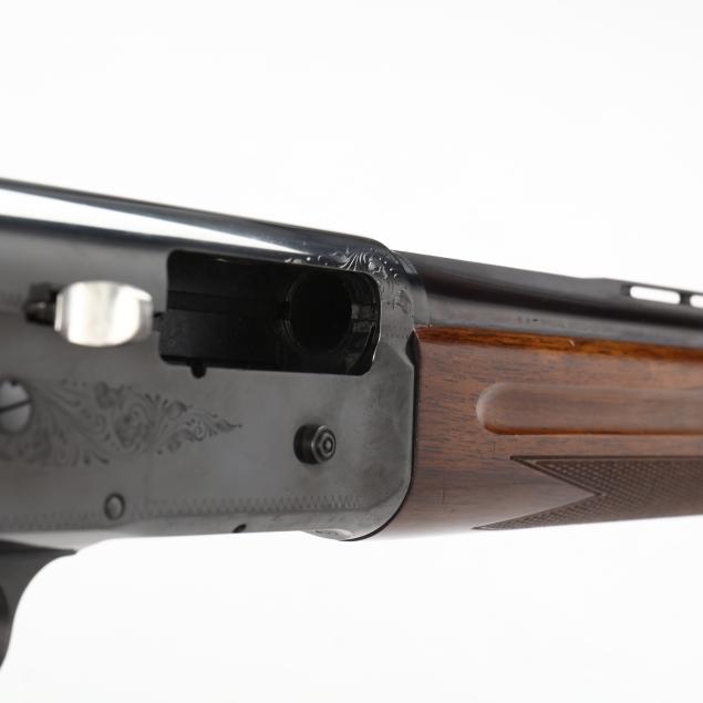 Serial number 68Z38787, made in Belgium, 25 5/8 in. blued barrel marked BROWNING ARMS COMPANY ST LOUIS MO. & MONTREAL P.Q. / MADE IN BELGIUM / SPECIAL STEEL 20 GAUGE SHELLS 2 3/4", ventilated rib with single front bead sight, barrel choked IC, blued receiver marked BROWNING TWENTY with additional scroll floral patterns, gold plated trigger, checkered walnut stock and forend with original buttplate marked BROWNING AUTOMATIC.