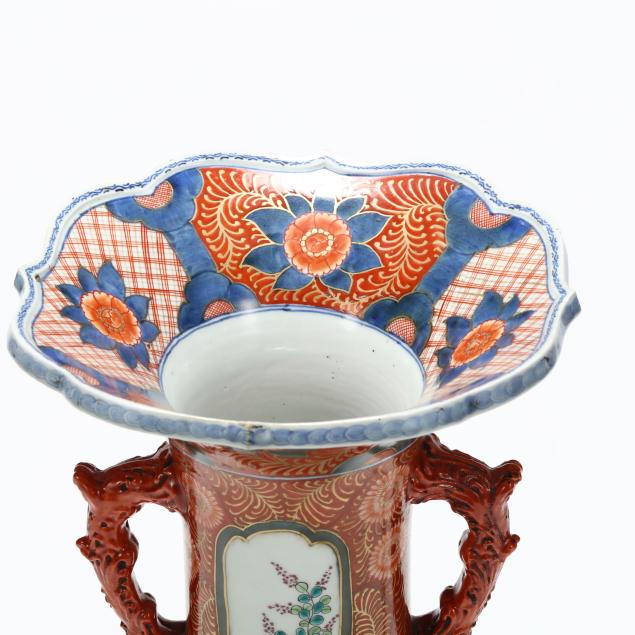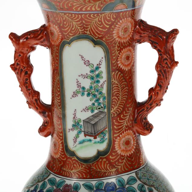 Meiji period (1868-1912), underglaze blue and iron red porcelain decorated with overglaze red, turquoise, purple, green, and gilt enamels, featuring registers on each side depicting a bird on a branch against a background of foliate decoration and patterning, the trumpeting neck with foliate double handles, and landscape scenes, presented together with a carved ebonized base.