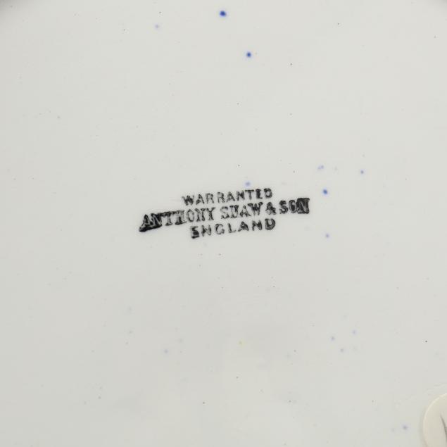 English, early 19th century, various sizes from the largest 11 in. plate to the smallest, a 2 1/2 in. butter pat, which has the impressed stamp "Enoch Wood Bursley". The 9 1/2 in. plate has an ink stamp "Anthony Shaw & Son". Others are not signed.