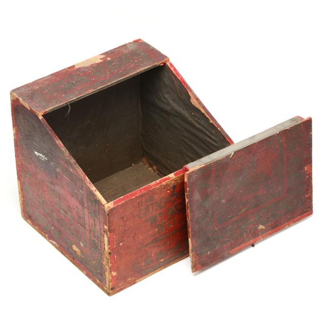 19th century, pine box with red and gilt chinoiserie paper, lead-coated paper lined interior, nailed construction, marked "13 LBS / Gunpowder Tea / No. 1 / Packed For / S. B. Hirsh & Bro., / Fredericksburg, VA."