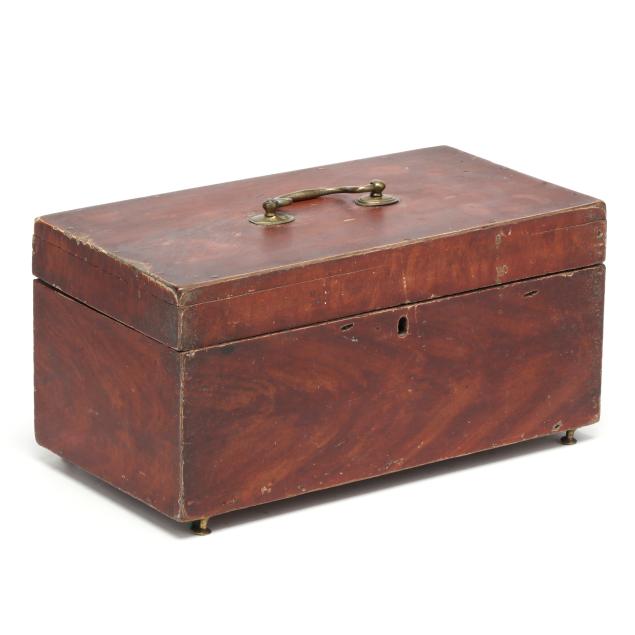 Early 19th century, flame mahogany faux-painted exterior with brass bail handle, poplar secondary, papered interior with mahogany till shelf, carved mahogany heart frame retaining hair behind glass, and an 1812 copy of the Bible; raised on brass feet.