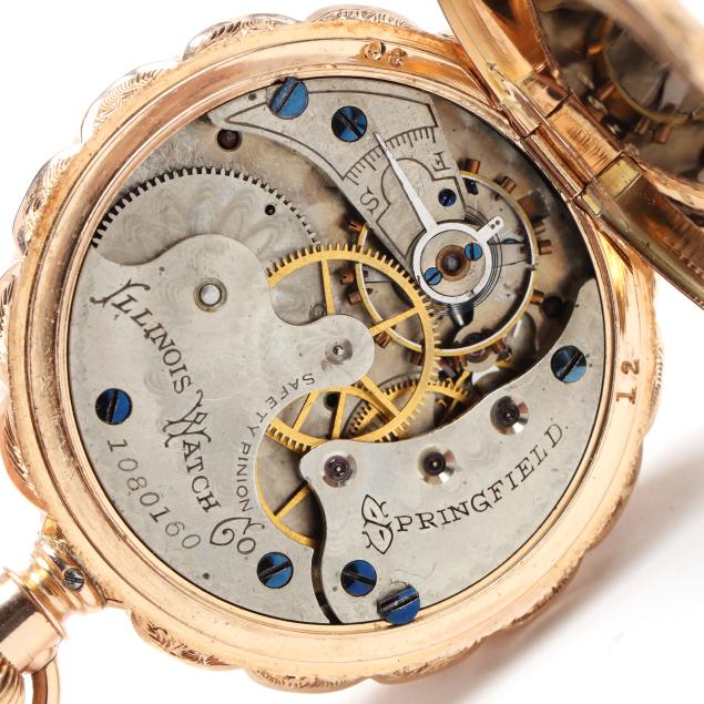 Circa 1891, lever set and stem wind, eleven jewels, grade 142, serial number 1080160, the open face case with scrolled, floral, and foliate engraved detailing, the signed white dial with blued steel spade hands, black Roman numeral hour markers, and subsidiary seconds dial at 6:00 hour, the movement signed Illinois Watch Co / Springfield and numbered 1080160, the case signed B.W.C.Co, numbered 651236, stamped 14K, and engraved NANNIE / FROM / BROTHER JIMMIE / June 19th/91.