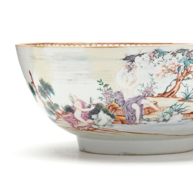 The first, late 18th century, in the famille verte palette, with alternating vignettes depicting figures creating silk to weave and fisherman at sea against a patterned gilt ground, foliate spray to the interior (5 x 12 1/4 in. dia.); the second, a Judgement of Paris bowl, circa 1750, porcelain punch bowl hand painted with a continuous narrative to the exterior sides of the famous mythological scene showing the seated Paris handing Venus the golden apple while Juno, Minerva, Cupid, and a dog look on, interior well with floral spray and gilt ruyi head border at the rim (4 3/4 x 11 in. dia.).
