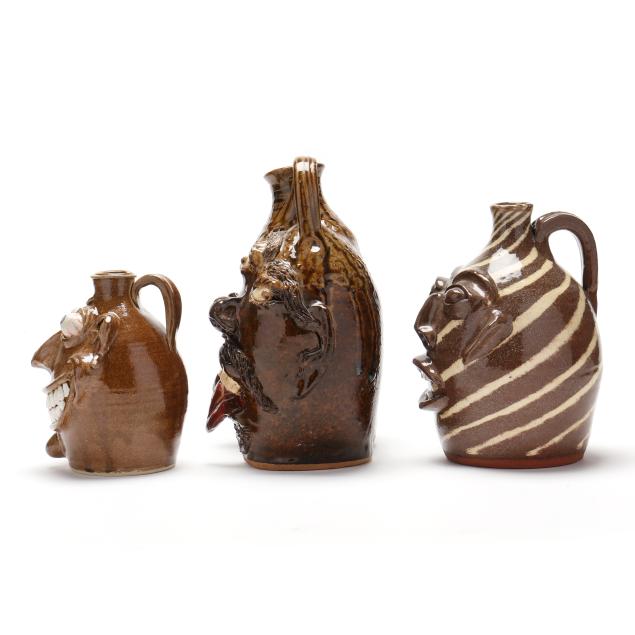 A side-by-side conjoined double face jug, signed on the underside "Crystal King" dated 2001 (10 x 8 in.), a two color swirl jug stamped on the underside "Walter Fleming", and a grinning Stacy Lambert small jug, inscribed on the underside and dated 12-2-01 (6 1/2 in.).