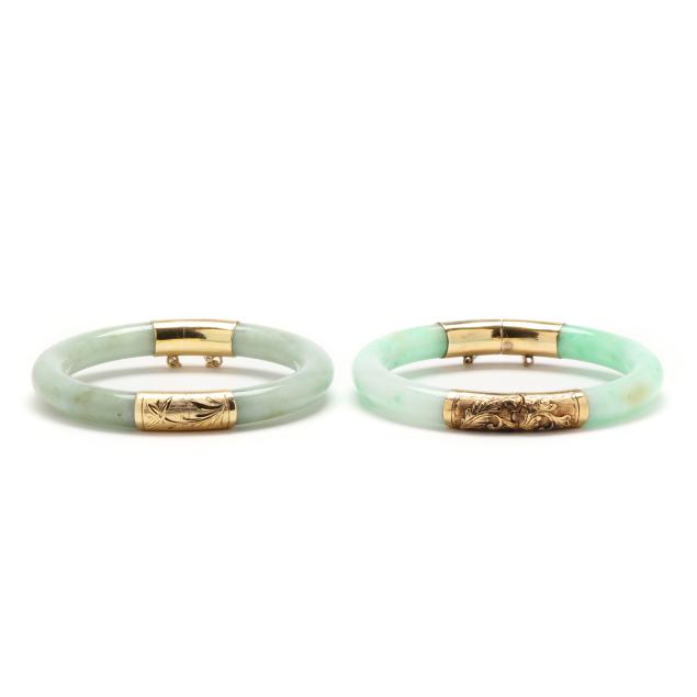 To include: one of hinged form, the gold end caps with foliate motif, completed with integrated box clasp and safety chain, testing 14KT (7 in. interior circumference); and one of hinged form, the gold end caps with floral motif, completed with integrated box clasp and safety chain, stamped 18K (6 5/8 in. interior circumference).