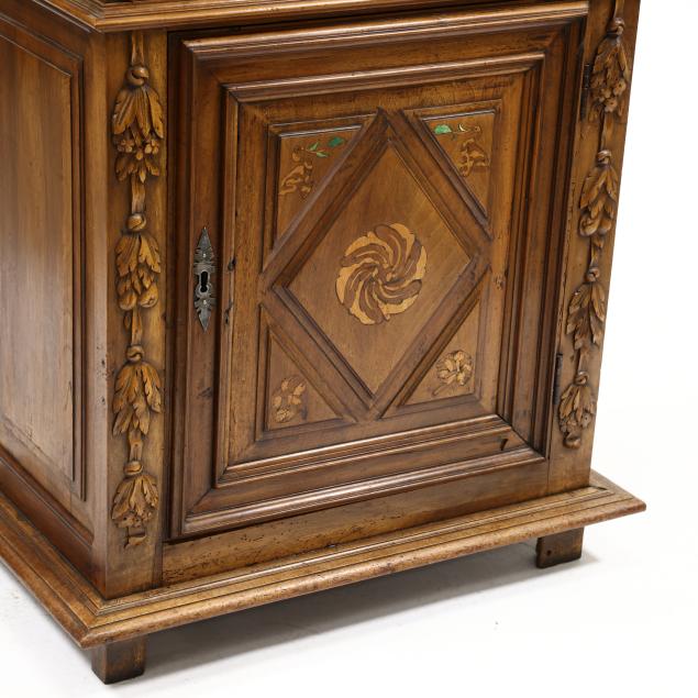 Likely Italian, early 18th century, two part form, pine and oak secondary, the upper cabinet with an applied projecting cornice above an inlaid frieze featuring avian and floral, both upper and lower hinged doors with repeating motif of central raised diamond panel and raised spandrels with avian and floral inlays featuring inlaid malachite leaves, shelved interior, the waist with single drawer, raised panel sides, projected molded base, straight feet.