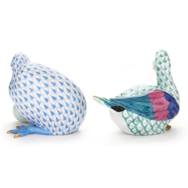 Includes a black penguin group on ice, pattern number 5175; a blue kiwi bird with egg; a green duck, pattern number 15336; a black pelican; and a small green duck, pattern number 50271; all marked.