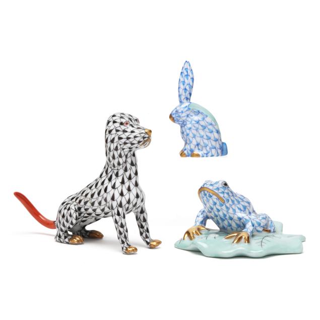 Hungary, includes a green kangaroo and baby figure, pattern number 15328; a blue seated cat, pattern number 5383; a green collie, pattern number 15399; a pink dolphin, pattern number 15395; a black hound dog, pattern number 15509; a blue frog on leaf, pattern number 5355; and a miniature blue bunny; all marked with company backstamps to underside.