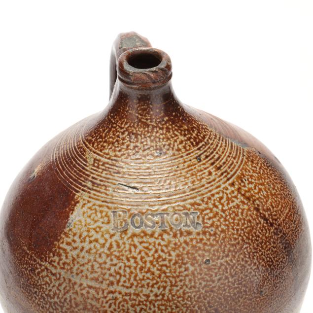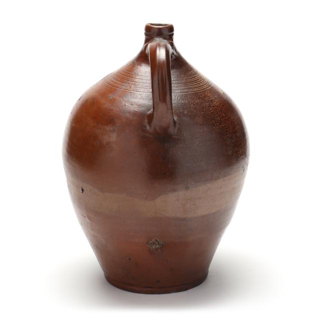 First quarter 19th century, salt glazed with iron oxide dip, ovoid jug with footed base, heavily-tooled shoulder, and grooved strap loop handle.