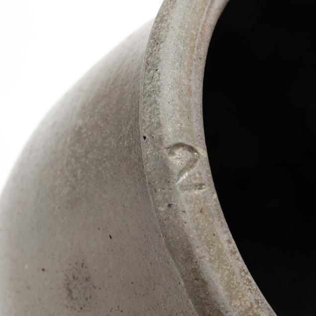 Second half 19th century, salt glazed, marked two gallon capacity, wide-mouth form with rounded rim, cobalt "EXCELSIOR WORKS / Isaac Hewitt, Jr. / RICES LANDING, PA.", additional decorative and stripe embellishments ( 10 1/4 in.) (glaze flake on the down-turned rim; kiln drips and lower body discoloration), the second is a marked five gallon "EVAN R. JONES PITTSTON, PA" painted with a chicken on a stump (13 1/2 in.) (kiln debris and a rim scape; exfoliation mostly to the lower 1/3 ).
