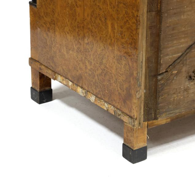 Second quarter 19th century, burl maple veneer, pine secondary, upper long projecting drawer above three bow-front drawers flanked by fully turned ebonized columns, straight legs with ebonized foot.