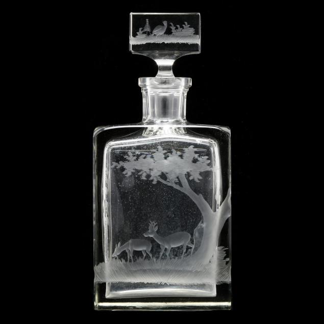 Bohemian, first half 20th century, clear crystal with heavily engraved forest landscapes depicting stag, quail, pheasants and snipe, includes a decanter (11 in.) and six glasses (4 3/8 in.); appears unmarked.