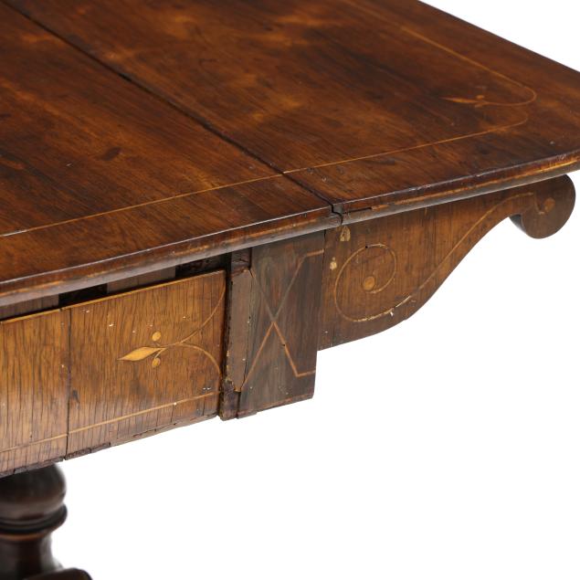 Early 19th century, rosewood veneer, oak secondary, rectangular top and drop leaves with banded and line inlay, the corners featuring stylized fleur de lis, double butterfly supports also finished in rosewood and nicely inlaid, two flush drawers to the front with repeating inlays, the back finished with two false panels, turned supports with down-swept legs with repeating inlays, brass paw feet and casters.