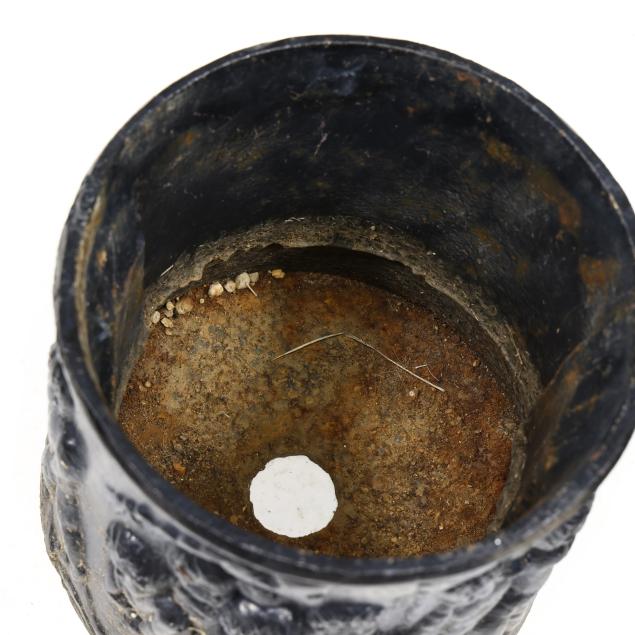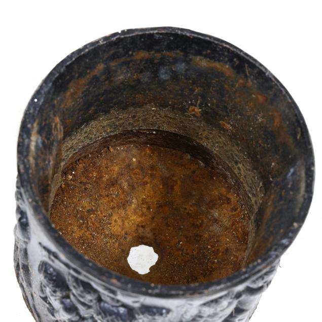 20th century, thick cast and black painted iron with raised figures surrounding the exterior, interior with central drain hole, flush bottom.