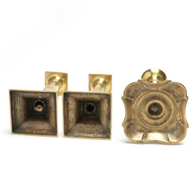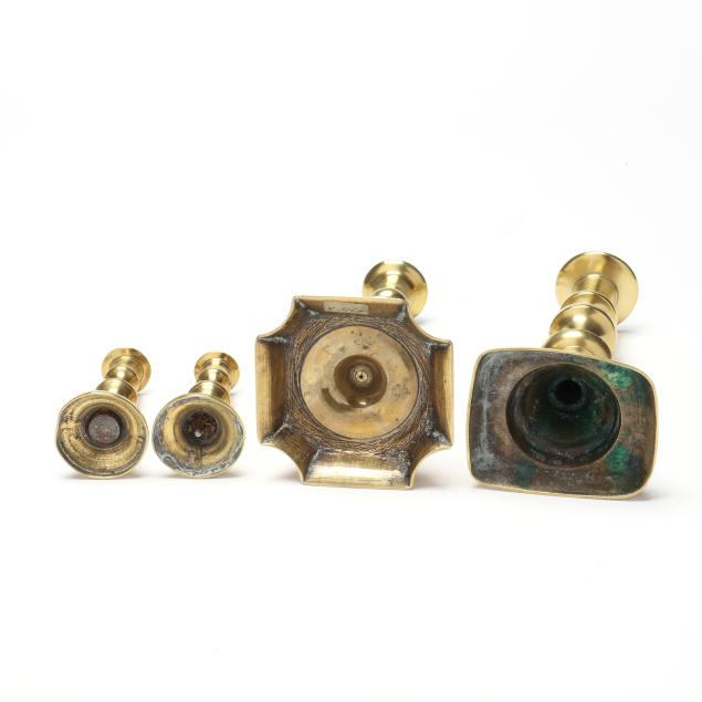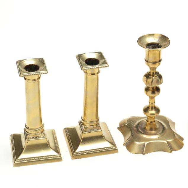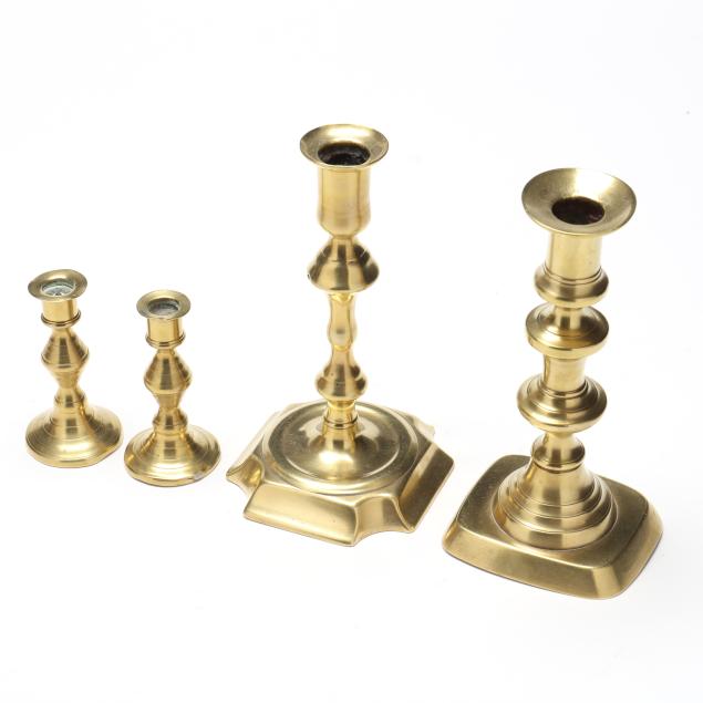Includes a Queen Anne candlestick, first half of 18th century, with brazed construction and serpentine base; a mid-18th-century candlestick with brazed conduction and canted corner base; a mid-18th century push-up candlestick with turned baluster form shaft and square base; a pair of 18th century turned push-up chambersticks; and a pair of Georgian columnar form push-up candlesticks; none marked.