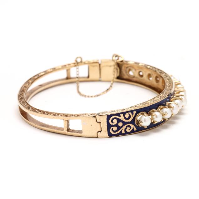 Of oval hinged form with upper section set with round cultured pearls and with blue enamel and gilt scrolled detailing, sides with engraved accents, completed with integrated clasp and safety chain, stamped 14K.