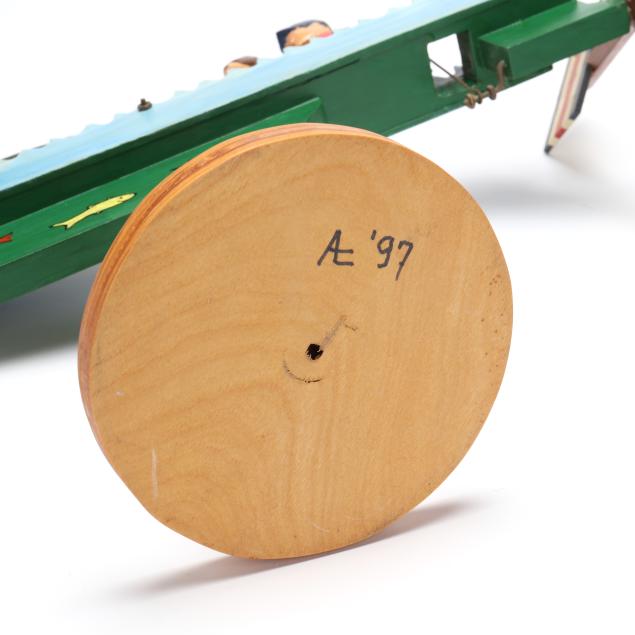 Carved, assembled, and polychrome painted wood, presented with a custom-turned wood base, signed and dated "AL '97" to underside of stand.