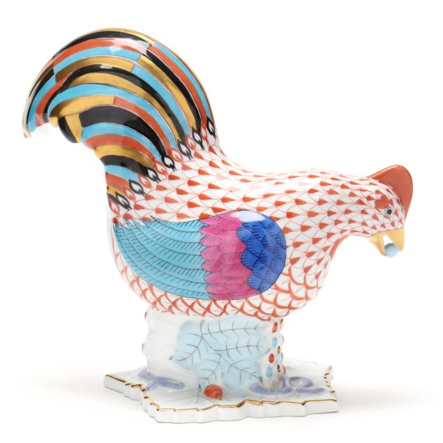Hungary, hand painted, a figurine of a rooster with a pearl in its mouth, standing on a leaf with a snake, and presented in rust fishnet with colorful plumage; model number 5016; with printed and impressed marks.
