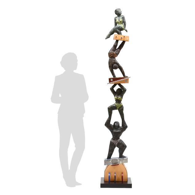 Her pedestal and wall-mounted sculptures are influenced by nature, textures, ethnic, and historical patterns, using carved wood, metal, paint, and mixed media.