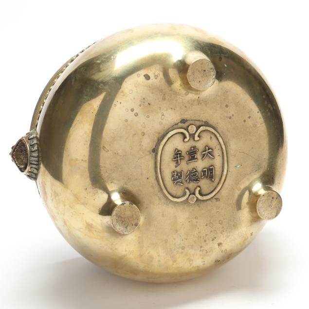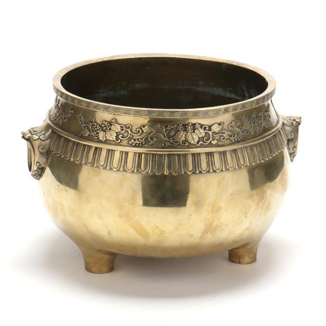 20th century, large censer with lion mask handles with wide open mouths, key motif encircles the mouth rim, below are stylized paulownia flower vines above a lotus petal border, raised on three stout feet, with an apocryphal six character Xuande mark to the underside.