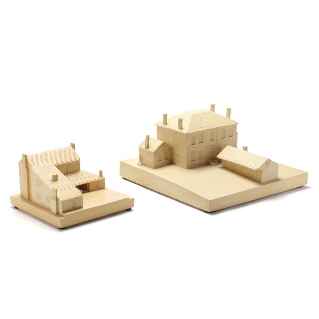 Circa 1930s, painted plaster, including an architectural model of Castlewood in Madison County, Kentucky (8 x 15 x 15 1/4 in.), and the Ephraim McDowell Home in Danville, Kentucky (6 x 9 x 9 1/4 in.). Both labeled to the corner with the W.P.A stamp, and inscribed with initials to underside, possibly by the W.P.A. artist.