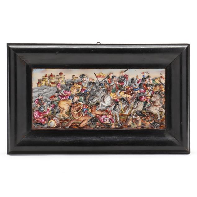 Likely early 20th century, hand-painted porcelain, depicting a lively European battle scene with musketeers, bearing crowned N mark to verso, framed.