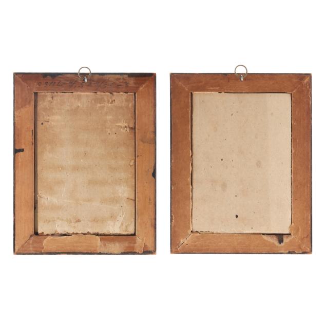 19th century or earlier, possibly Austrian or German, watercolor on vellum, laid on paper, both now wrapped against metal backing, each depicting 17th century royal sitter in finery against a scenic landscape with partisan polearm, the first portrait in long curly dark hair, with red and white plumed lobster tail armored helmet nearby; the second facing dexter with long auburn brown hair, the upper left with heraldic coat of arms divided quarterly with central inescutcheon. Both presented behind glass in later ebonized wood frames with gilt filet.