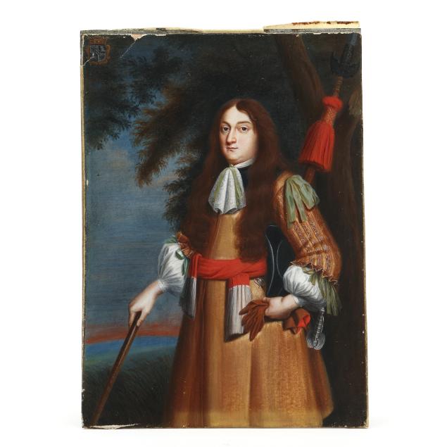 From a Private Collection, Washington, D.C. The heraldic coat of arms in the upper left of the portrait illustrates a crowned shield divided quarterly with double headed eagle and unicorn, with central inescutcheon.