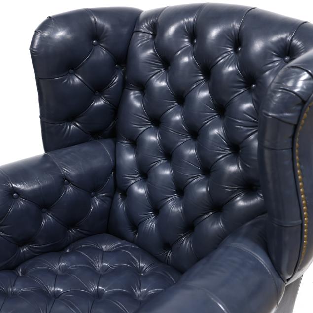 Late 20th century, in Williamsburg Blue leather button back upholstery, brass tack decoration.