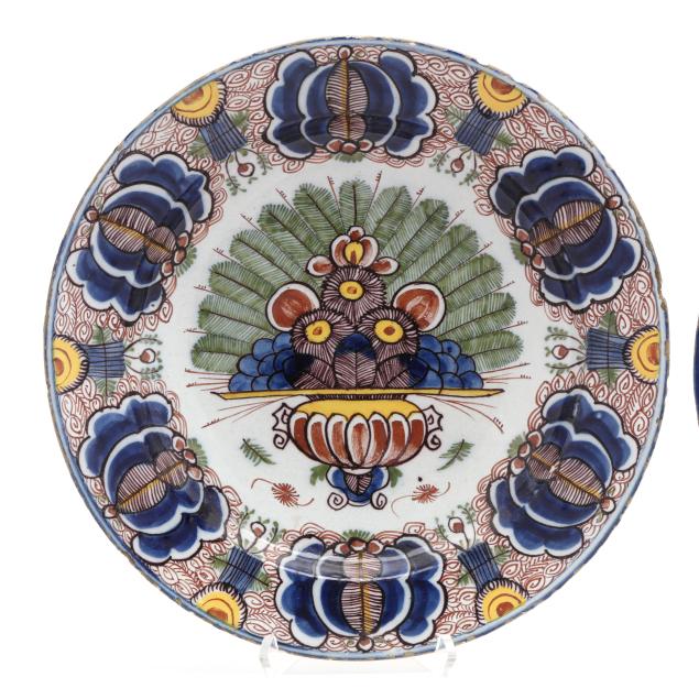 Mid to late 18th century, tin-glazed earthenware, including two plates hand-painted floral urn motif in bold polychrome colors of yellow, blue, iron red, green, and manganese violet, one with De Porceleyn Lampetkan factory mark to reverse, and the other labeled as "Bristol Delft", however with mark of De Klaauw factory; the third plate with radial floral red yellow and blue primary pallet, is unsigned.