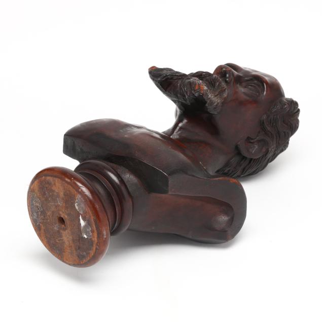 Circa 1900, carved mahogany, approximately 1/2 life size, mounted atop a turned wood socle, unsigned.