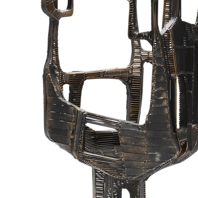 Circa 1970s, welded metal with applied paint and gilt, of figural and architectural form, signed to the underside.
