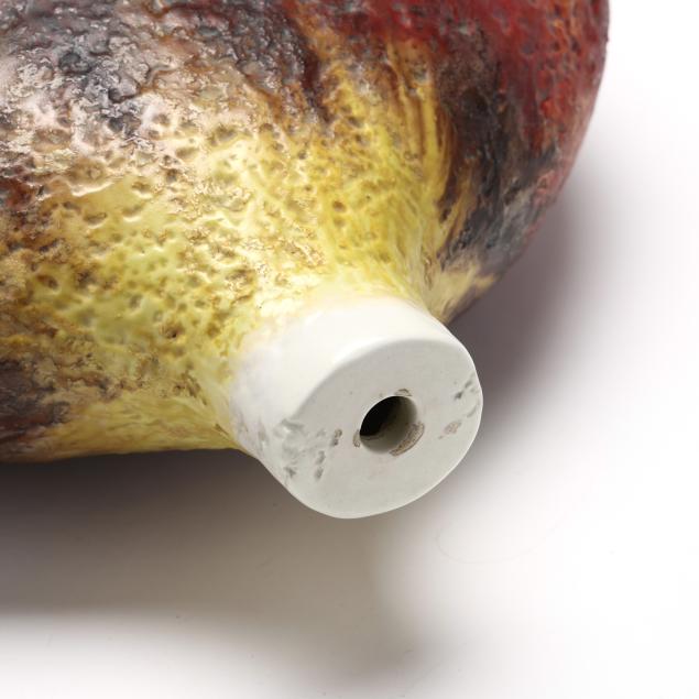 Italy, volcanic glazed ceramic, of disc form with bottle neck with red to yellow drip glazes, signed to the underside.