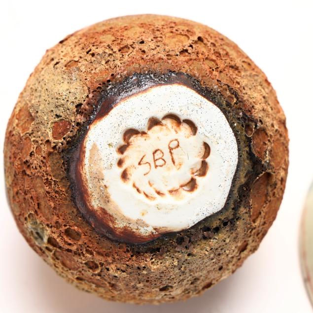 Late 20th century, glazed porcelain, including a small footed bowl in conical form with lustre glazed rim, with "SBP" potter's glyph to underside (2 3/4 x 6 x 6 in.), and a small spherical form vase, with "SP" potter's glyph to underside (4 x 3 1/2 x 3 1/2 in.). Included with the Lot is a monograph