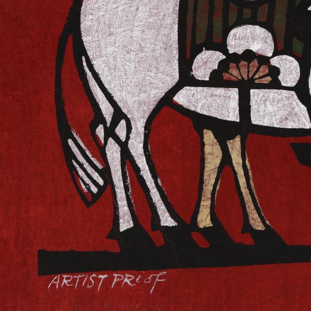 From the Collection of Duke Hospital, Sold to Benefit Duke Arts and Health Sadao Watanabe was born in Tokyo in 1913, was baptized as a Christian in 1930, and throughout his career, based his designs exclusively on biblical subjects. That said, the Christian stories and figures of his works are interpreted via traditional Japanese techniques. Watanabe took part in the folk-art movement in Japan which began in the 1930s as an attempt to preserve various traditional arts, among them stencil printing, which Watanabe appreciated. Watanabe and Yoshitoshi Mori were the best-known 'sosaku hanga' artists who used the medium called kappazuri (stencil printing), a technique related to 'katazome' (stencil dyeing) which originated in Okinawa (the technique there was called 'bingata').