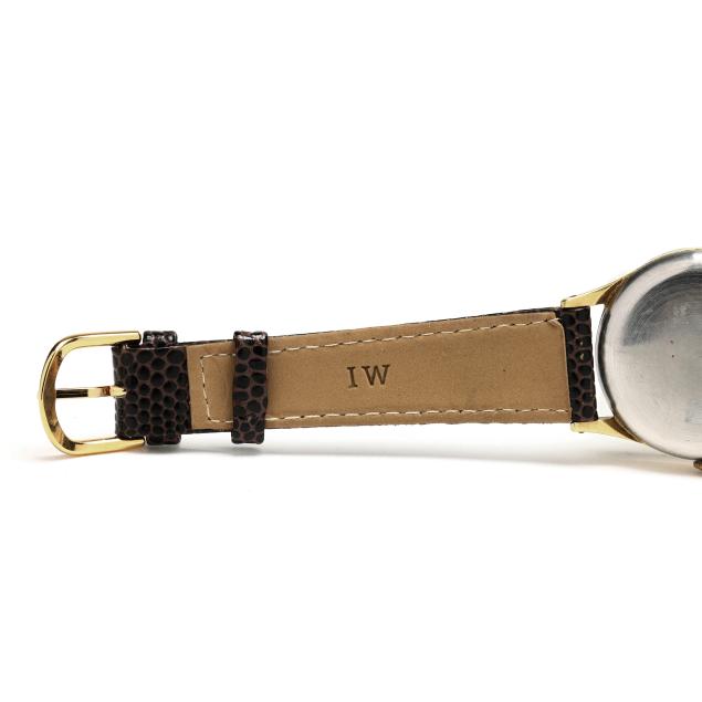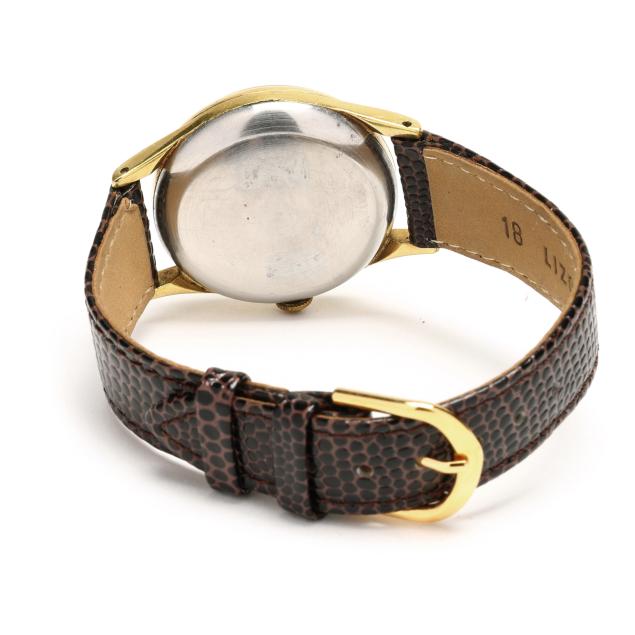 Circa 1947, manual wind, Omega 30 T2 SCPC, reference number 2391 / 4, serial number 11433241, the round gold-tone case with polished bezel, the signed antiqued dial with dagger hour markers and leaf hands, the brown textured leather strap with gold-tone buckle, the inside caseback signed and numbered.