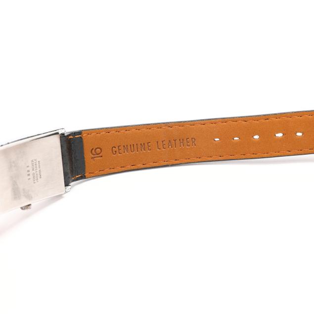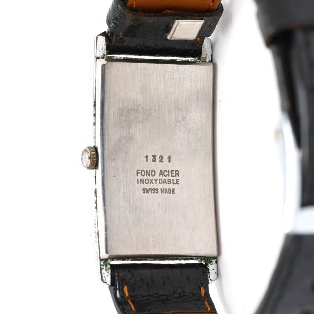 Manual, Felsa 4130, reference number 1321, the rectangular stainless steel case with polished bezel, the signed silver dial with black Roman numeral hour markers and black sword hands, the black leather strap with silver-tone buckle, the caseback numbered.