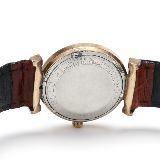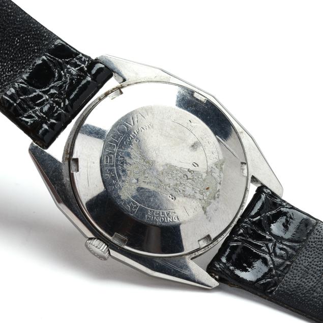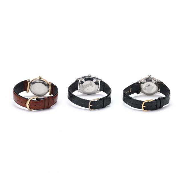To include: an "EW" model, circa 1959, automatic, serial number D342685, the round stainless steel case with polished bezel, the signed black dial with dagger hour markers and dagger hands, the black leather strap with gold-tone buckle, the caseback signed and numbered (case 31mm; 8.25 in.) (wear to case and leather strap; running at time of examination); an "FW" model, circa 1960, automatic, Bulova 10BZAC movement, serial number 803250, the geometric stainless steel case with polished bezel, the signed silver dial with dagger hour markers and dagger hands, the black leather strap with gold-tone buckle, the caseback signed and numbered (case 32mm; 8 in.) (wear to leather strap, running at time of examination); and a "TAW" model, circa 1961, automatic, Bulova 10BZAC movement, serial number F198209, the gold-plated round case with polished bezel and textured surround, the signed silver dial with gold-tone Arabic numeral hour markers and gold-tone dagger hands, the brown leather strap with gold-tone buckle, the caseback signed and numbered (case 31mm; 8 in.) (good estate condition; running at time of examination.).