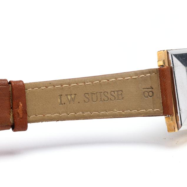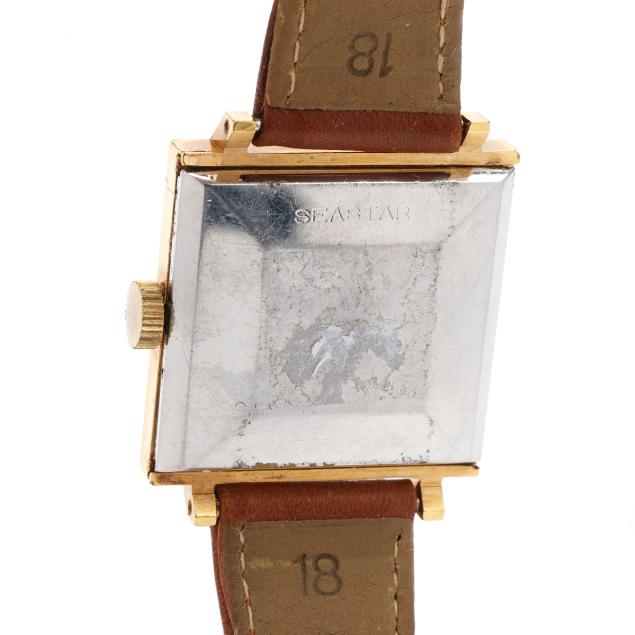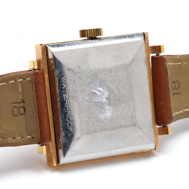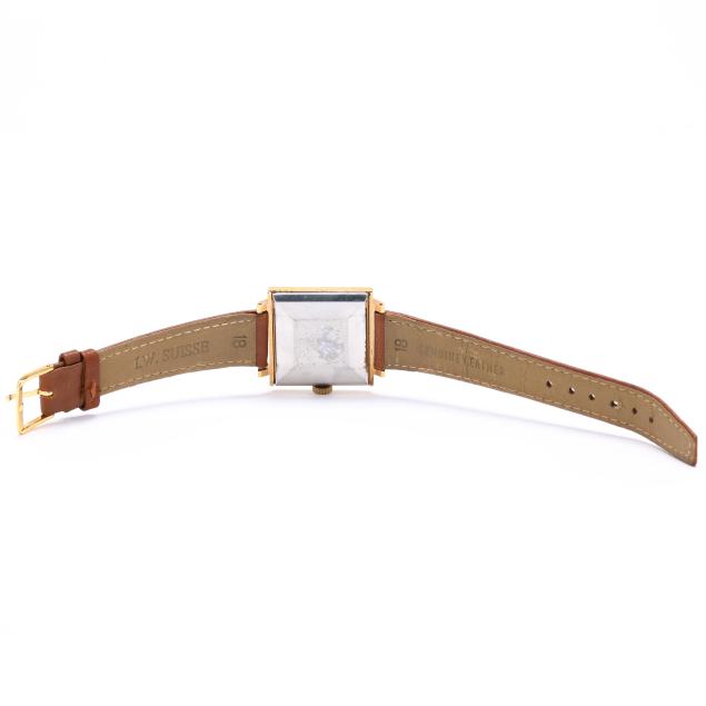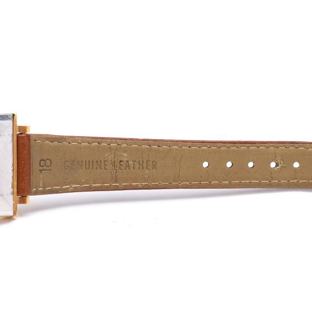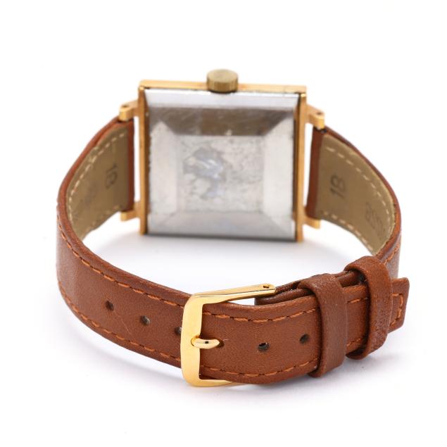 Automatic, the square gold-plated case with polished bezel, the signed silver dial with black and gold baton hour markers, gold Dauphine hands, and date window at 6:00 hour, the brown leather strap with gold-tone buckle, the caseback signed.