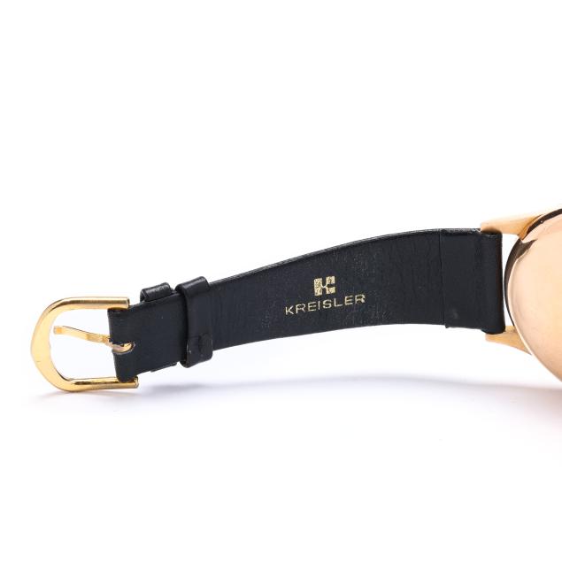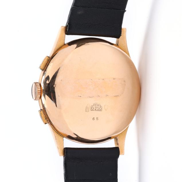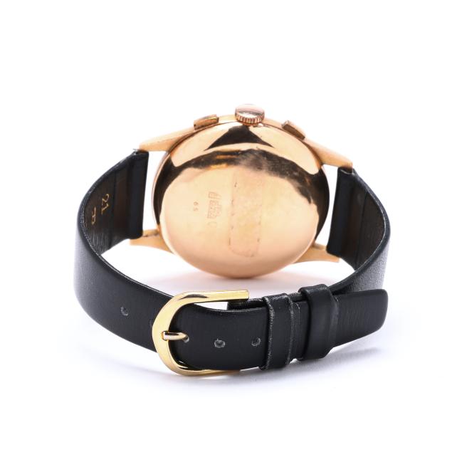 Manual wind, Landeron 48, reference number 65, the round gold case with polished bezel and Swiss hallmarks for 18KT, the signed black dial with Arabic numeral hour markers, leaf hands, subsidiary second dial at 9:00 hour, subsidiary chronograph dial at 3:00 hour, and tachymeter, telemeter, and minute outer registers, the black leather strap with gold-tone buckle, the caseback numbered 65 and with Swiss hallmarks for 18KT, the dust cover engraved METAL and numbered.