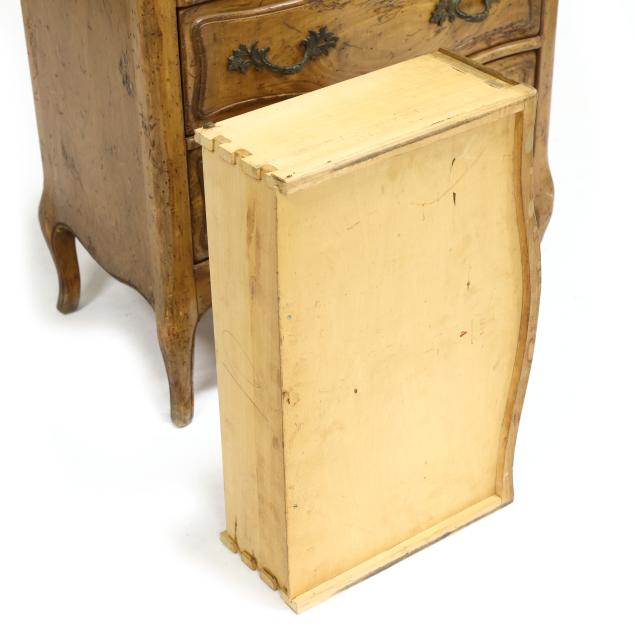 Late 20th century, distressed fruitwood, top with 3/4 gallery edge, slight serpentine case with three raised panel drawers on short cabriole legs.