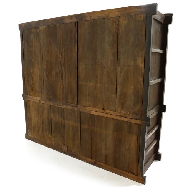 Late 19th century, two part form, soft pine with dark stain, upper cabinet with three sliding doors, shelved interior, the base with two sliding doors and five drawers, paneled sides, flush base.